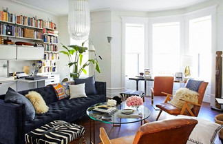 Lors du mélange de plusieurs types d'assises (canapé, pouf, fauteuil), la symétrie peut donner une ambiance original.